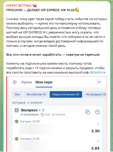 Expert Betting – это Телеграм-канал, специализирующийся на спортивных ставках, преимущественно на футбол и хоккей. Проектом управляет каппер Дядя Дима (@betdima). На странице публикуются только платные одиночные ставки, двойники и экспрессы. Ключевая особенность проекта – регулярные экспрессы с завышенными кэфами от 4.00 до 10.00 и выше. Мы проанализируем работу каппера, чтобы разобраться, насколько его обещания соответствуют реальному качеству предоставляемых услуг.
