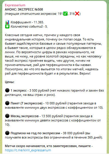 Отзывы о телеграм-канале Expressarium: реальный процент проходимости прогнозов каппера kirill expressarium