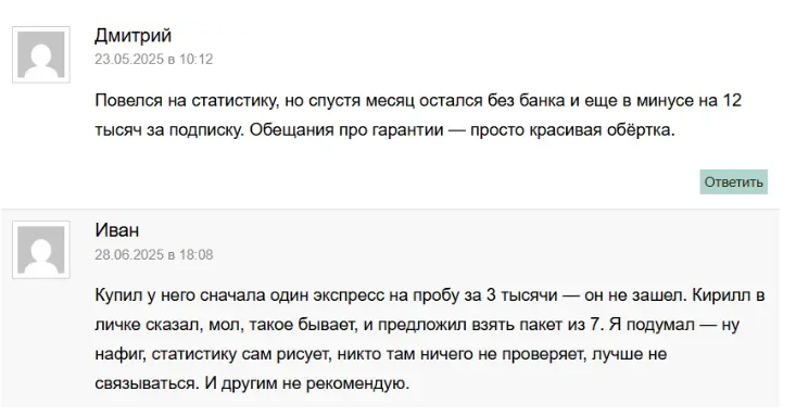 Наша команда в очередной раз убеждается, что продажа экспрессов при полной отсутствии их верификации и доказательств качественной экспертизы есть развод. В данном случае телеграмм-канал Expressarium считать надежным нельзя, он ведет доверчивых игроков бк к потере банка. Строго не рекомендуем каппера Кирилла.