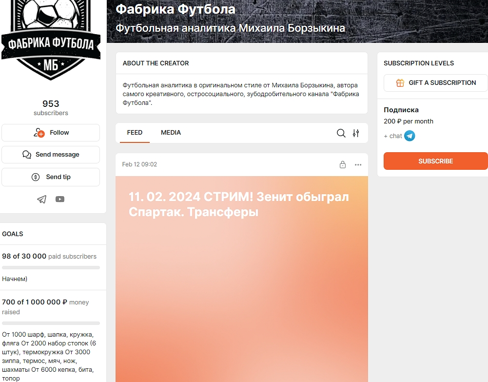«Хотелки» Борзыкина оплатят подписчики Бусти, где тот за пару недель февраля 2025 собрал 700 рублей донатами. Судя по счетчику в профиле @fabrika_futbola на Boosty, платно за контентом каппера следят всего 98 фанатов, хотя тот надеется на 30000 «спонсоров».