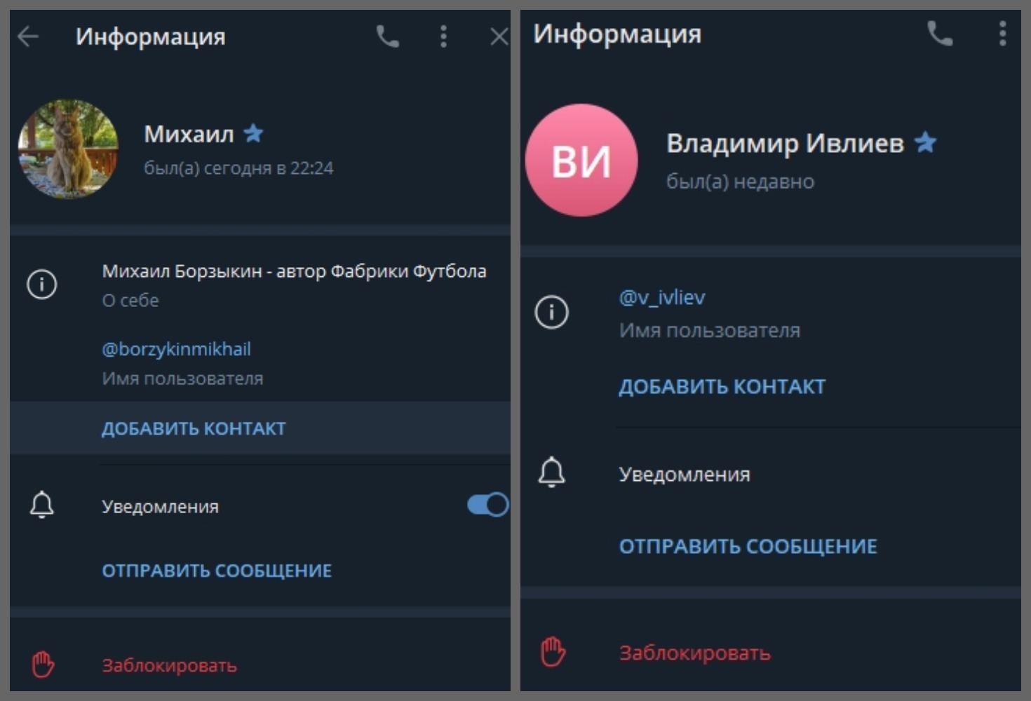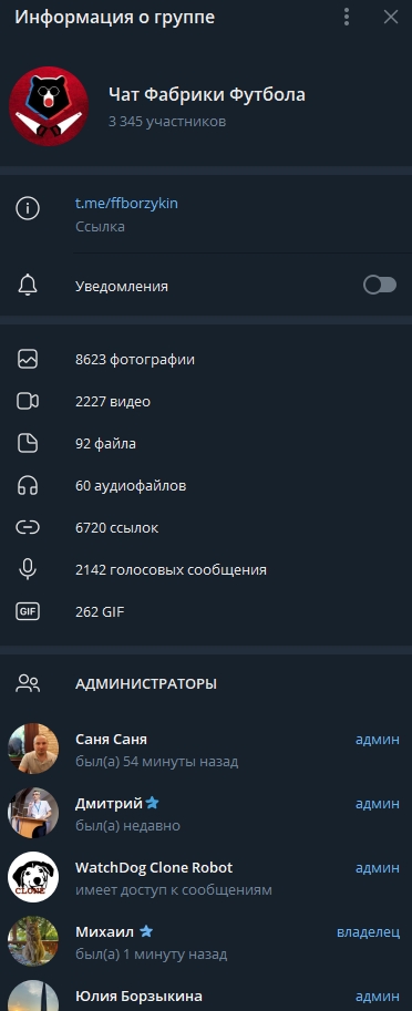 Именно это и привлекло внимание при подготовке к разоблачению, хотя на первый взгляд в бесплатном чате Ffborzykin с 3350 фолловерами нет ничего выходящего за рамки. Борзыкин и Владимир Ивлиев публикуют здесь околофутбольные новости, а подписчики обсуждают их почти без ограничений, при этом список админов группы также открыт.