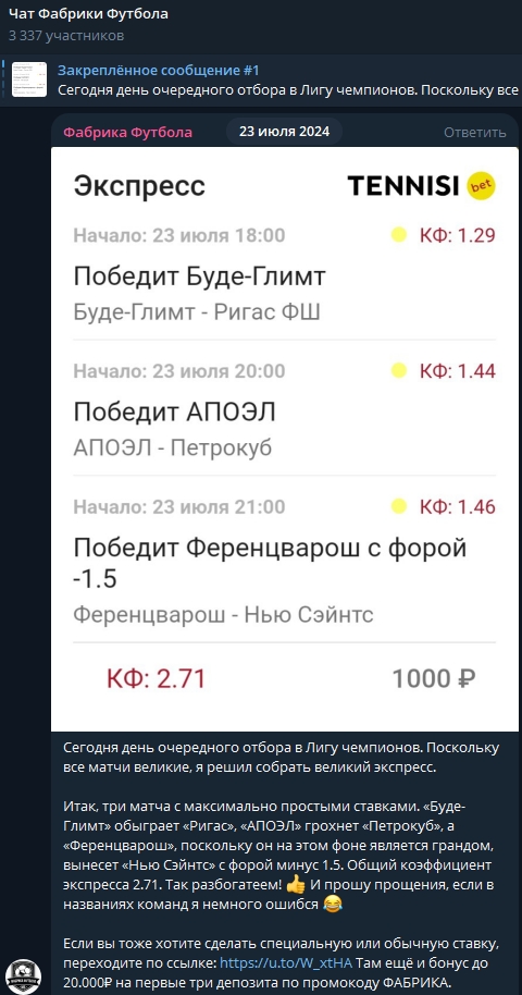 На роль профи-прогнозиста Михаил Борзыкин не претендует, так как продвигает связанные с беттингом услуги эпизодически. Тем не менее, ряд призывов админа Фабрики Футбола и коллеги @v_ivliev изначально подозрительны и роднят тех с сомнительными каперами, облюбовавшими Telegram.