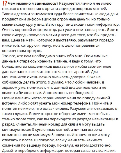 Владимир Стаховский — не аналитик и не беттинг-эксперт, а просто посредник. Он не проводит анализ матчей, не дает стратегии и не предлагает платный контент с глубокой аналитикой. Его бизнес — перепродажа «инсайдов» о договорных встречах от анонимного источника.