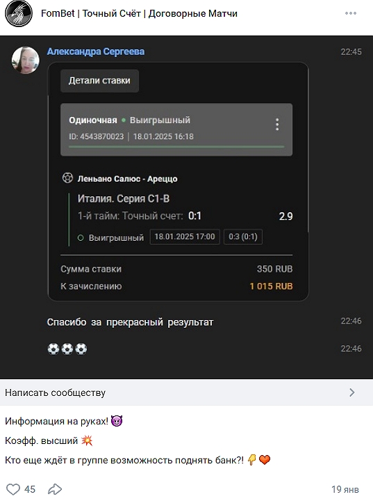 Сообщество «FomBet | Точный Счёт | Договорные Матчи» — типичный пример ресурса, работа с создателями которого сделает вам серьезный минус к банку. @Pronin_Bet и @Fom1nbet даже не стараются скрыть это, начиная глумление над клиентами уже с «закрепа» комьюнити.