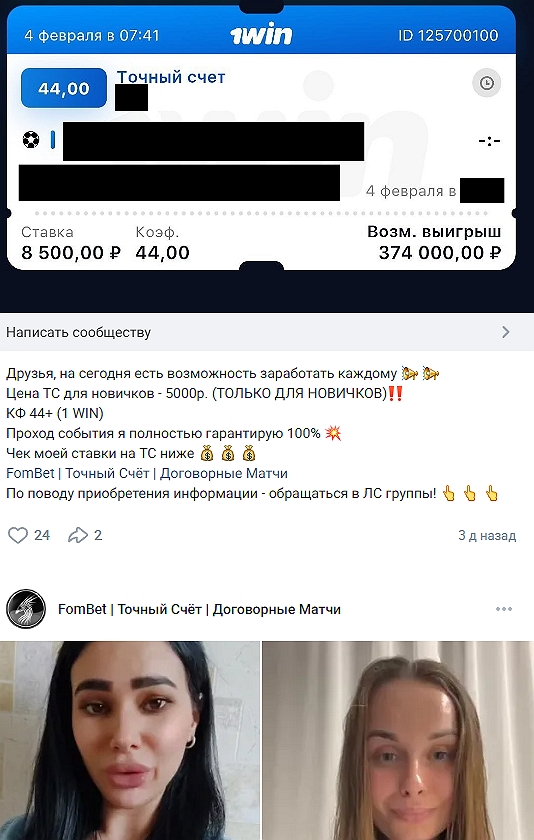 Что же предлагают «лицезреть» Фомин и Пронин, известные в Сети только по разоблачениям и гневным отзывам на Fomin_Bets? Это экс-адрес их группы «FominBet | Точный счет | Странные матчи», где те с 15.11.2023 устраивают «цирк с конями», не относящийся к профи-беттингу. Админы — ярые поклонники показа увесистых пачек купюр, с которыми вероятно даже спят в обнимку в перерывах между «сеансами» развода игроков. @Pronin_Bet и @Fom1nbet пересчитывают их в машинках, вертят в руках и даже демонстрируют вместе с паспортом, чтобы зазевавшийся клиент с гарантией доверился им и вынес все деньги из дома.