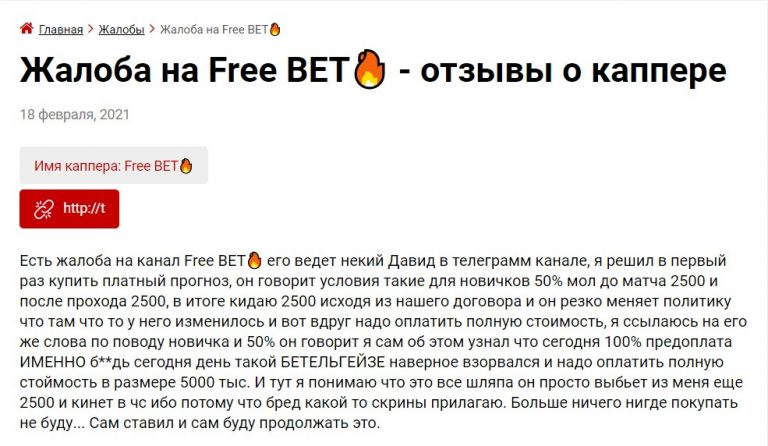 В основном канале Free Bet публикуются только положительные отзывы. Это переписки с клиентами и скрины. Но возможности оставить комментарии подписчикам нет. На сторонних ресурсах и форумах встречаются негативные отзывы об этом проекте. Пользователи жалуются на низкую проходимость прогнозов и удаление отрицательных результатов из отчётности. Некоторые открыто пишут о том, что стали жертвами развода.