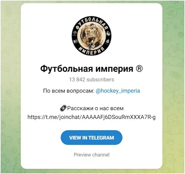 Не так давно телеграмм-канал Футбольная империя по ссылке @footballimp имел аудиторию свыше 13 тысяч человек. При этом вовлеченность не соответствовала численности аудитории, публикации просматривали порядка 2000 человек. До Футбольной империи канал назывался Хоккейная империя. То есть капер резко поменял свою специализацию, что, конечно же, выглядит довольно подозрительно.
