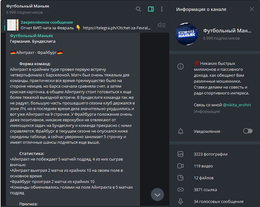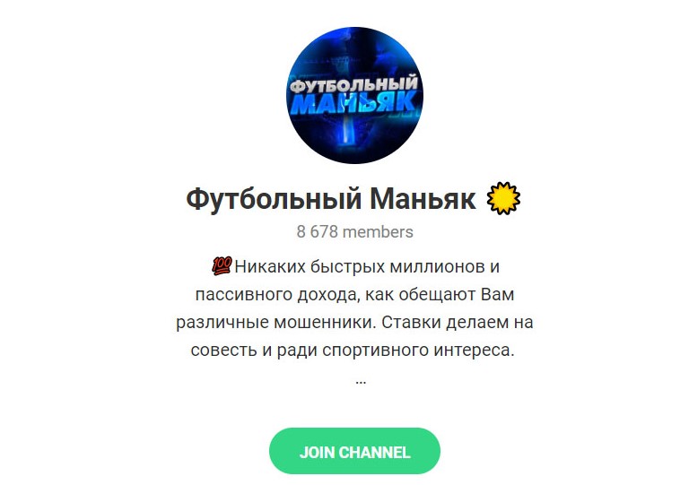 Канал с названием Футбольный маньяк появился в telegram еще в 2019 году. С тех пор аудитория проекта достигала более 8500 тысяч. Можно предполагать, что данная цифра – во многом результат накрутки. Такое подозрение сложилось из-за низкого числа просмотров на постах, а также отсутствия активности людей в виде реакций.