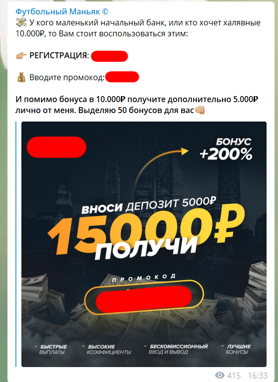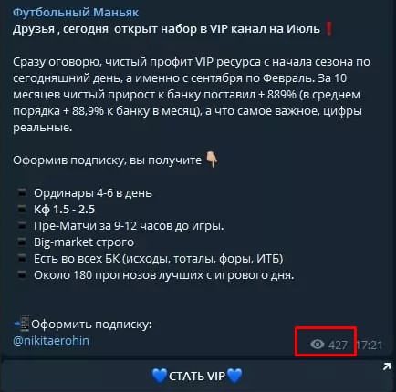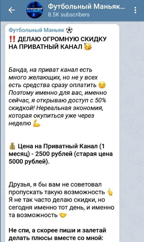 Сотрудничество с каналом Футбольный маньяк можно оформить в переписке с автором. Ерохин продает доступ в закрытый вип чат, предоставляя гарантию кратного увеличения депозита.
