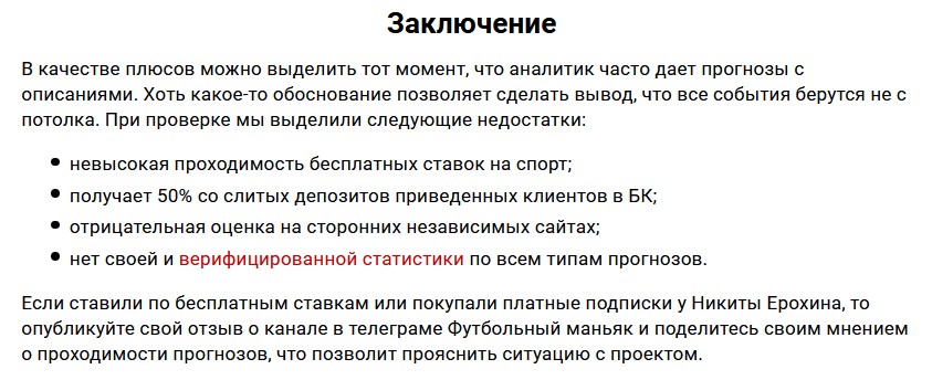 Эксперты нашей команды составили отчет о деятельности капера под именем Никита Ерохин и склонны считать, что любые услуги данного прогнозиста могут нести опасность для Вашего игрового банка. Подробнее обо всех признаках мы изложили в данной статье.