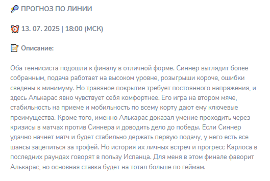 Бесплатные прогнозы GAME SET каппер содержали анализ теннисных игроков, была видна насмотренность каппера в этом виде спорта. Он подчеркивал положительные стороны соперников, но не приводил статистику их предыдущих матчей. Коэффициенты брались от 1.8 до 2.05. Экспрессы не собирались.