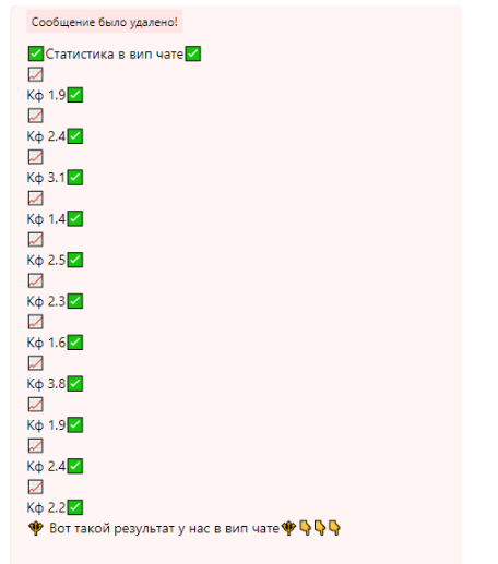 Статистика также не представлена. В публикациях каперы списком показывают, как закончились прогнозы. Есть отчеты только по вип-чату. Если судить по имеющейся информации, проходимость в среднем составляет 90-100%. Вероятно, статистика обманчива. Отчетов в рамках верификатора не предоставлено.
