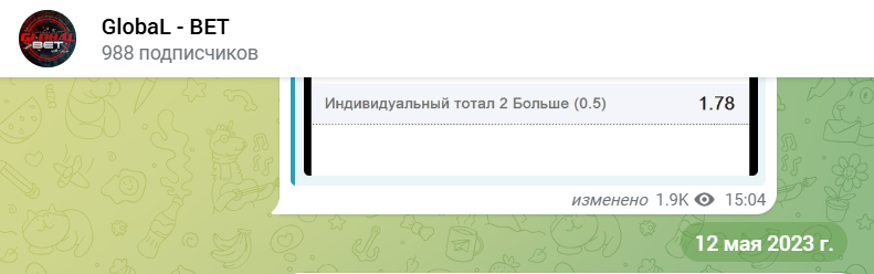 Аналитик проекта @GlobaL1BET на данный момент приостановил деятельность, ТГ доступен, но не обслуживается. Причина неизвестна – возможно, не удавалось зарабатывать на канале.