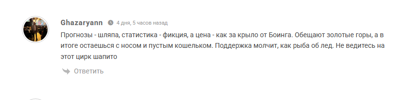 В самом канале Голевой Момент отсутствуют репосты благодарностей, скрины переписок и любые признаки живого общения с подписчиками. Все сообщения создаются автором анонимно. В открытых источниках удалось найти негативные отзывы, в которых говорится о потере средств после покупки доступа в VIP.
