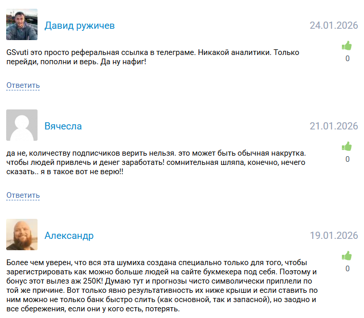 Прогнозов на спорт, анализа матчей, разборов коэффициентов или рекомендаций по управлению банком нет. Капер @gsvutikz_admin не раскрывает информации о себе, не показывает опыт в беттинге и не демонстрирует реальные кейсы сотрудничества. Вся активность сводится к привлечению игроков на внешний сайт.