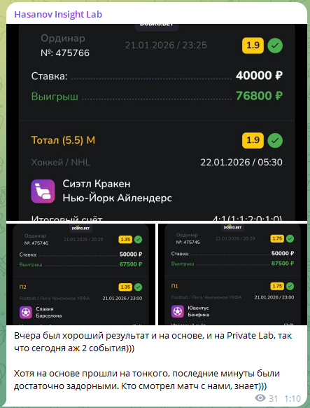 Hasanov Insight Lab в Telegram: методы разбора матчей и результаты прогнозов каппера