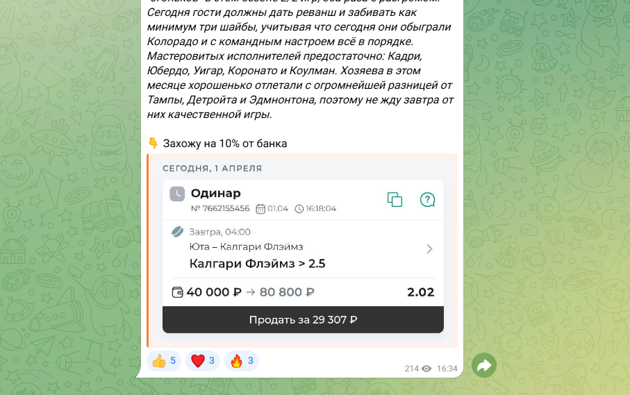 В Телеграмм-канале публикуются прогнозы с коэффициентами в районе 1.7–1.8, обычно это ставки на фаворитов в хоккейных матчах. Конечно такие котировки дают неплохие шансы на выигрыш, но во прибыль от таких ставок мизерная. Игроку заработать приличную сумму будет сложно.