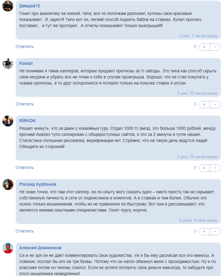 Каппер сообщает только о плюсах по ставкам, используя отчеты в виде скринов купонов. Минусы не фиксируются. Не предоставляет прогнозист и результатов с подтверждением в системе верификаторов, из-за чего нельзя исключить фальсификацию статистики.