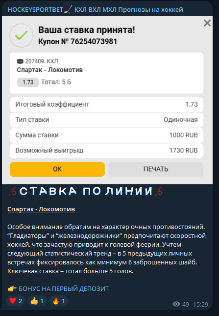На проекте «Hockeysportbet🏒 КХЛ ВХЛ МХЛ Прогнозы на хоккей» игрокам предлагают авторскую аналитику. Прогнозист утверждает, что делится своим субъективным мнением и не заставляет никого из клиентов повторять свои ставки. Рассмотрим, насколько надежные предикты доступны на канале.