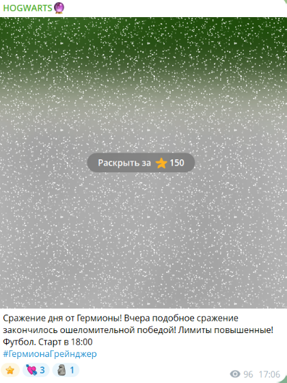 Вип-чата у анонимного автора нет, продажи за деньги — тоже. Заработок строится по нестандартной схеме — увидеть пари можно за звезды telegram. Один прогноз стоит порядка 250-300 рублей.