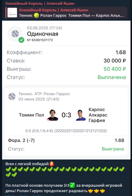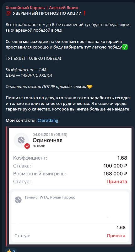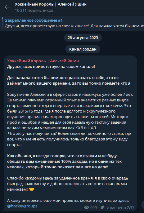 В Телеграм-канале Хоккейный Король Алексей Яшин игроки найдут аналитику ставок на разные спортивные направления. Каппер проекта утверждает, что имеет большой опыт в беттинге и делится с аудиторией исключительно авторскими прогнозами, которые регулярно приносят прибыль, если судить по статистике. Ниже разбираемся, надежную ли спортивную аналитику предлагают на ресурсе, или его основатель использует мошеннические схемы и зарабатывает на разводе подписчиков.