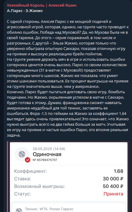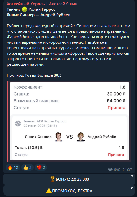Прогнозист не вызывает доверия и из-за своей специализации. Изначально ТГ-канал использовался для распространения прогнозов на хоккей. Сейчас же в контенте присутствуют ставки на теннис и другие виды спорта. Но ни один профессионал не будет работать с несколькими спортивными направлениями, так как из-за подобной разносторонности гарантированно снизится точность аналитики.