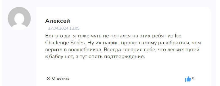 Пишите свои впечатления о Ice Challenge Series, если вы столкнулись схемой развода с его стороны и ставьте оценку для рейтинга.