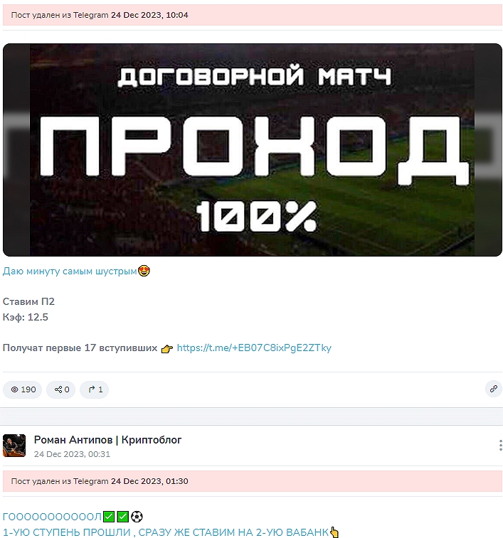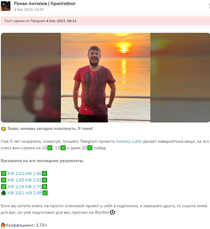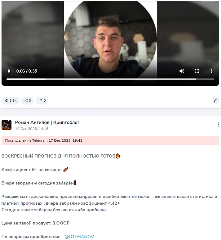 Илья Гильманов | Спортивный блог — ресурс спортивного аналитика, торговавшего экспрессами в Телеграм в конце 2023. После пары месяцев продаж тот исчез, отдав руководство каналом «раскрутчику депозитов» @Vlad_manager111. В проверке разберем признаки обмана на проекте, последняя известная вывеска которого — «Роман Антипов | Криптоблог».