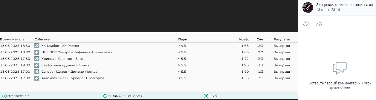 Что мы видим в этой группе? Развод подписчиков платными экспрессами на футбол и хоккей с коэффициентами от 3 до 24 пунктов, и вот что удивительно — для любого набора событий они всегда одни и те же. Скамеры из сообщества «Экспрессы Ставки Прогнозы на Спорт» пытаются подловить неопытных беттеров историями о сложении котировок ординаров в составе «паровозов», но все букмекерские конторы на деле перемножают их между собой.