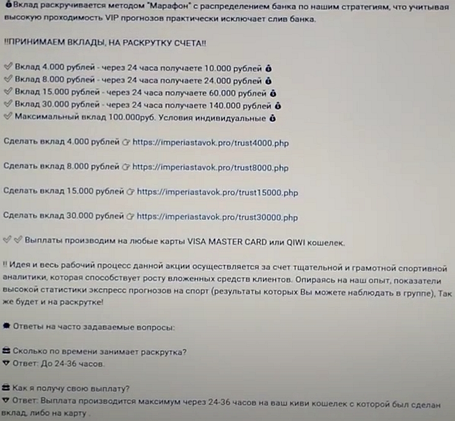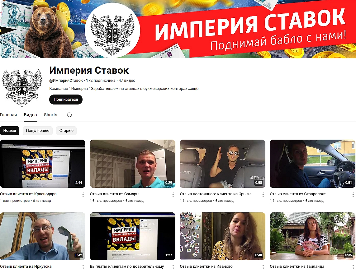 Вот и в брошенном 6 лет назад ютуб-канале Империя Ставок мы видим типичные признаки развода беттеров, невнимательных инвесторов да и вообще всех, кто попадется под руку. Здесь анонимы говорят о «компании Империя», якобы умножающей капиталы клиентов, но не предлагают доказательств законности начинаний.