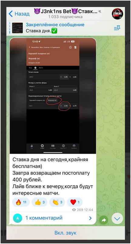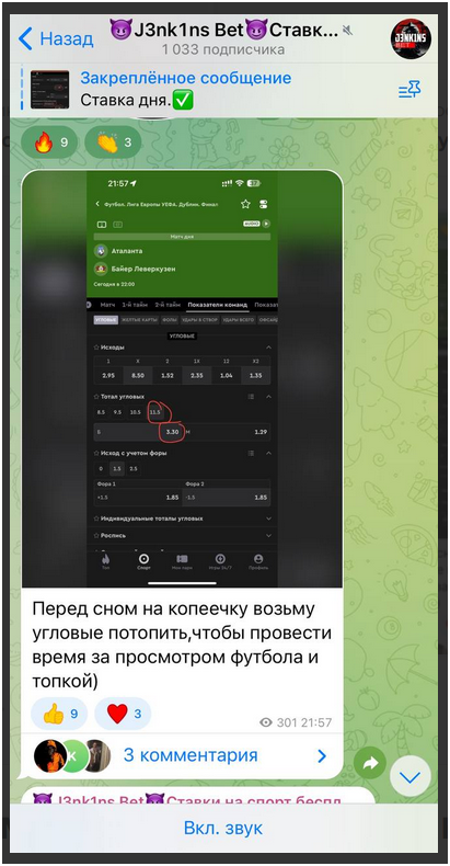 Деятельность телеграмм-канала J3nk1ns Bet