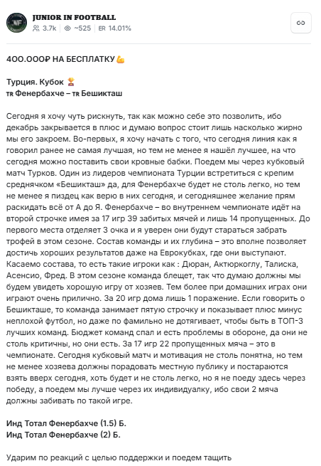 Телеграм-канал 𝐉𝐔𝐍𝐈𝐎𝐑 𝐈𝐍 𝐅𝐎𝐎𝐓𝐁𝐀𝐋𝐋 – авторский проект каппера, который занимается анализом футбола. Прогнозист не ограничивается только ТОП чемпионатами, а анализирует линию БК и в менее востребованных состязаниях. Рассмотрим, приносят ли его ставки доход от беттинга.