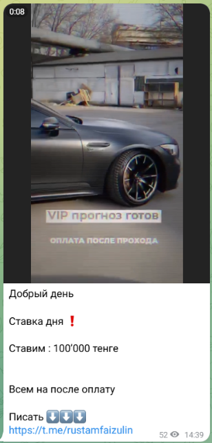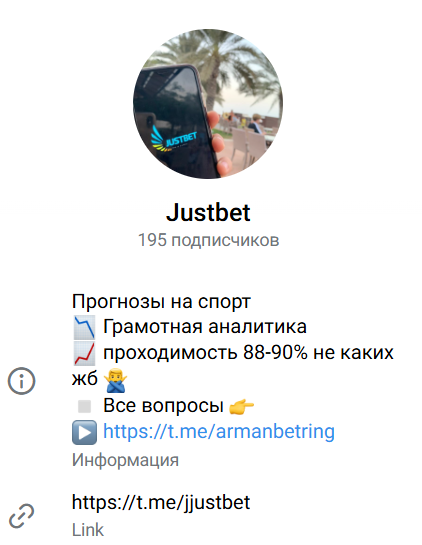 «Justbet» — Телеграм-проект, посвященный ставкам на спорт. Его ведет прогнозист под ником rustamfaizulin, который предлагает беттерам прогнозы на футбольные матчи и периодически продвигает экспрессы по схеме послеоплаты.