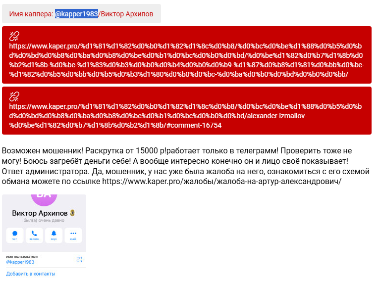 На профильных сайтах есть только разоблачения схемы мошенничества капера Viktor Arhipov и жалобы от клиентов. Положительных отзывов или комментариев от довольных подписчиков найти не удалось.