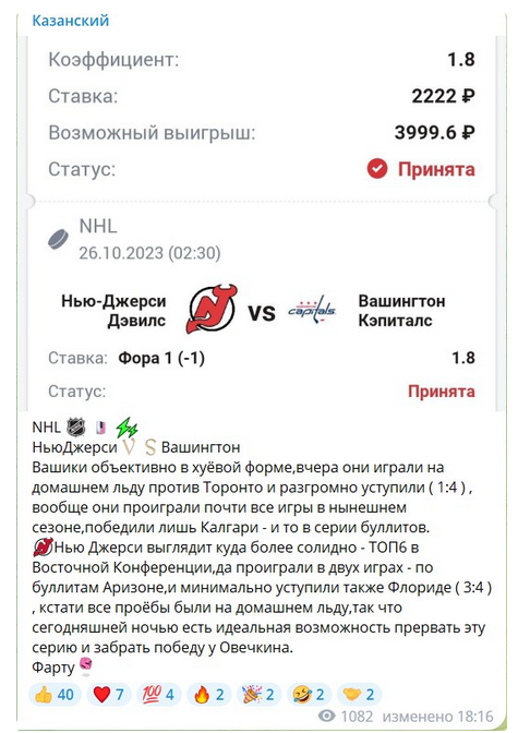 Казанский – каперское сообщество в Телеграмм, создателем которого является аналитик kazsan26. Утверждает, что имеет большой опыт в беттинге, в ленте делится с фолловерами ставками на хоккей и футбол. Пытается донести до аудитории, что на ставках можно получать огромную прибыль.