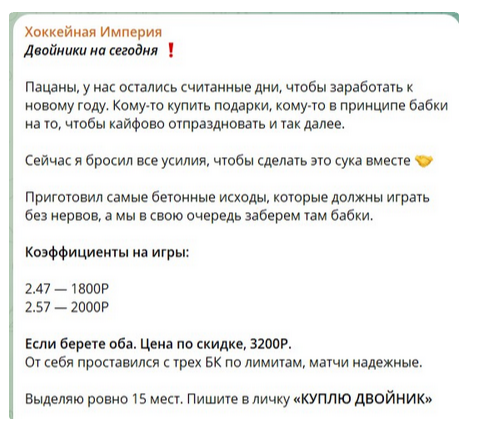 - Клиентам Александра гарантирует большую прибыль в ставках на хоккей. Постоянно привлекает их в свой ВИП-канал для совместной работы. При этом почти ничего не рассказывает о сотрудничестве – все данные нужно узнавать в личке после внесения оплаты.