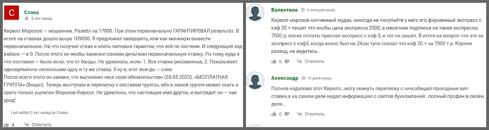 Ждем отзывы на Кирилла Морозова, если пострадали от злоумышленника или располагаете проверенными данными о его действующих ресурсах.