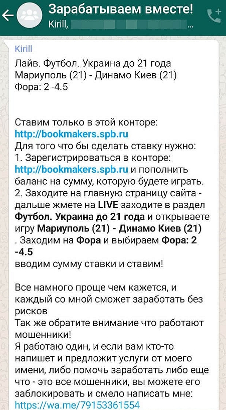 К примеру, ранее в WhatsApp Morozovkir7777 продвигал контору Bookmakers Spb Ru, являющуюся исчезнувшим зеркалом оператора азартных игр Melbet. Даже без прогнозов Морозова слить банк в нелегальной БК можно максимально быстро, а рекламу подобных площадок как раз и пресекает РКН с переменным успехом.