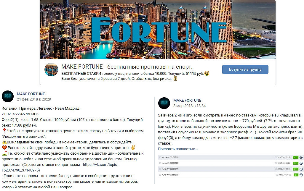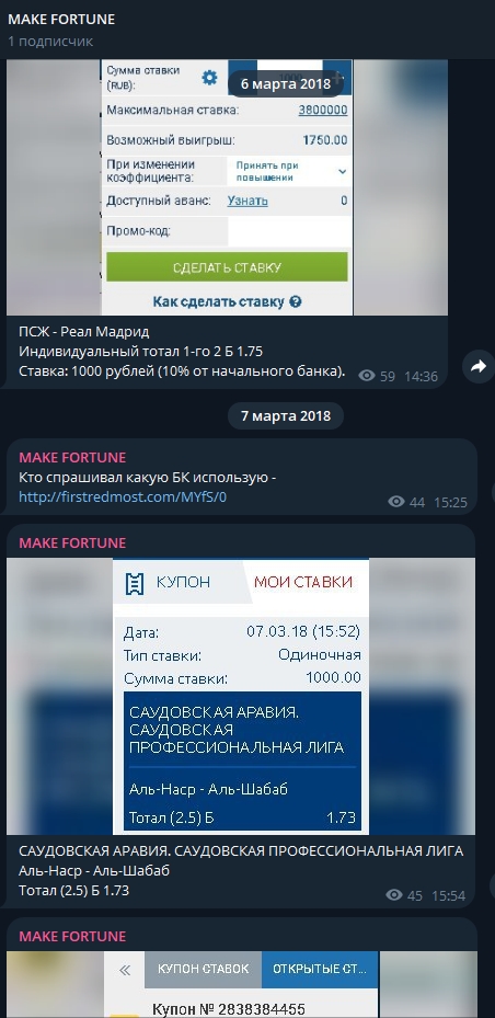Тогда разводила действовал с адресов @makefortune и @makefortuneold, а затем перебрался в один из первых телеграм-каналов для обмана беттеров. Это @makefortuneofficial — ресурс без подписчиков, работавший с 22.02 до 10.04.2018.