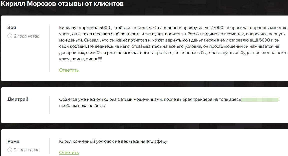 Жалобы на Кирилла Морозова найдены на разных ресурсах верификации, потому речь о наговоре на аналитика не идет. «Раскрутка» со скамером кончается требованием очередного платежа за «разблокировку вывода», а отказавшиеся от перевода клиенты отправляются в ЧС.