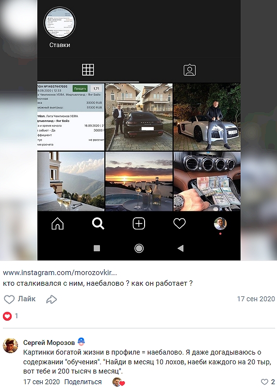 Советуем сразу исключить сотрудничество с персонажем, ведь любые озвучиваемые им истории нацелены на обман клиентов. Так, в запрещенном Инстаграм @Morozovkirill777 демонстрирует типичные признаки скам-активности — скрины с люксовыми авто и прочие «доказательства» красивой жизни. Та якобы светит подписчикам, рискнувшим купить ординары и «паровозы» с привлекательными коэффициентами, но судя по отзывам на Кирилла Морозова обольщаться не стоит.