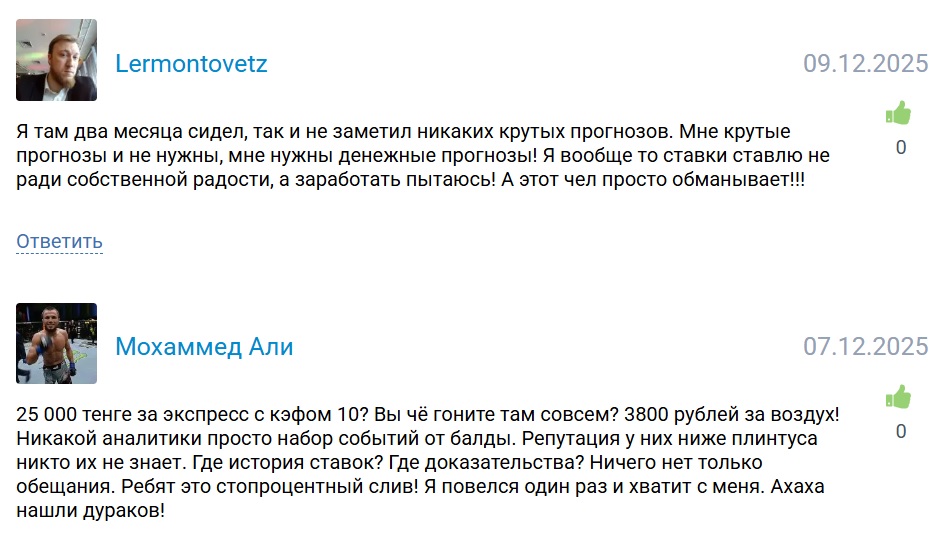 Реальные отзывы и комментарии пользователей на сторонних ресурсах — в основном жалобы. Клиенты пишут о сливе банка, отсутствии анализа и фейк-результатах. Игроки отмечают, что проект — не надежный, рейтинг нулевой.