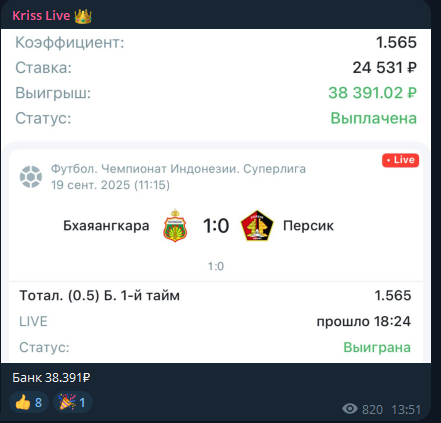 Отзывы клиентов о Телеграм-канале Kriss Live: реальная статистика проходимости прогнозов каппера Kriss 👑