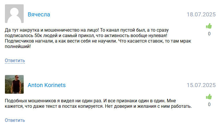 По окончании работы капер публикует итоговый скрин с успешной раскруткой. Но полноценной статистики проходимости ставок, ссылок на верификаторы с подтвержденными отчетами нет. Вероятно, все результаты поддельные. Есть на канале и реклама БК.