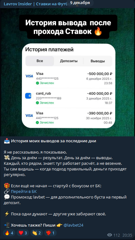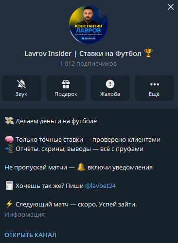 Телеграм-канал «Lavrov Insider Ставки на футбол»: отзывы подписчиков и итоги анализа деятельности lavbet24