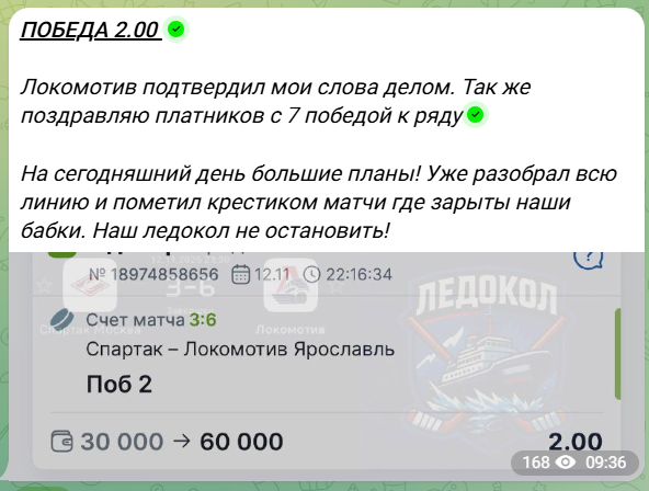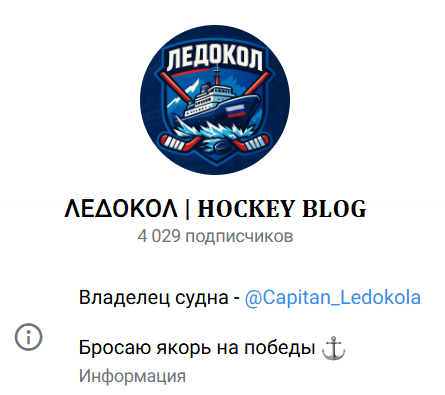 «Ледокол Hockey Blog» — телеграм-канал со ставками на хоккей, где прогнозист под ником @Capitan_Ledokola предлагает ординары и платные советы для игры в букмекерской конторе.