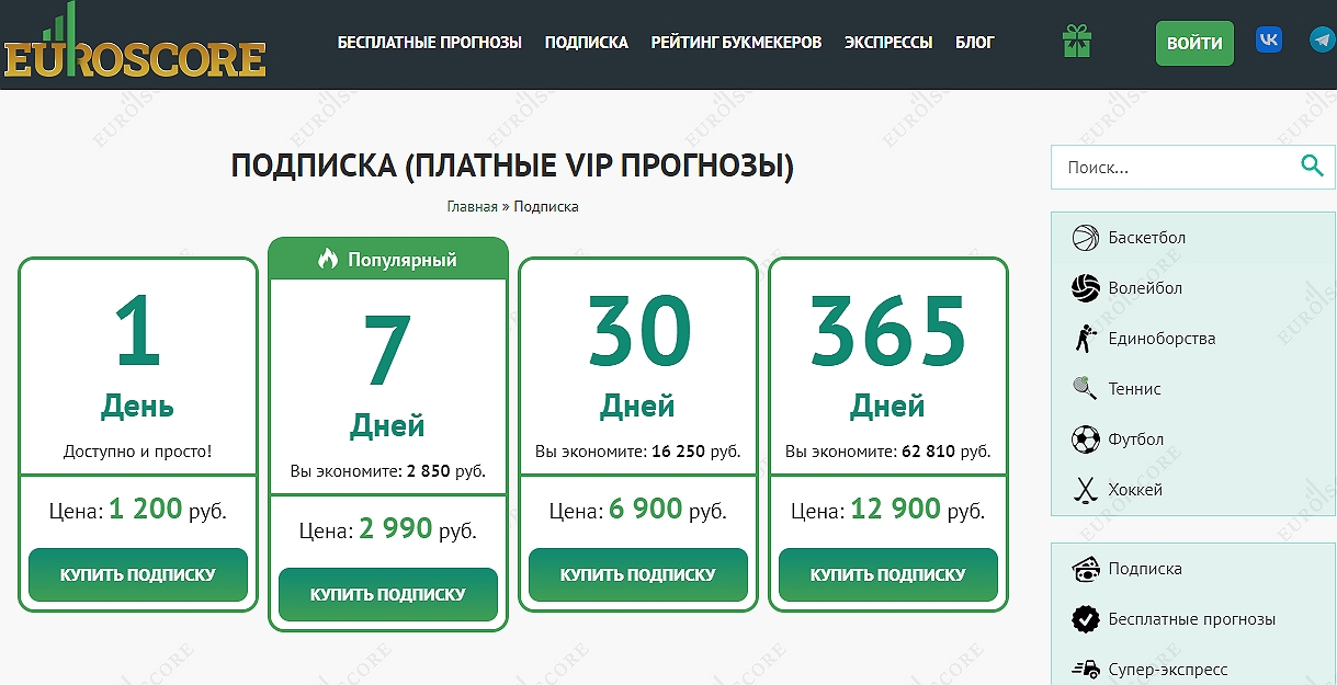 Непропорциональность цен на разные варианты прямо указывает на развод, ведь никто не станет анализировать матчи 10 месяцев бесплатно, требуя фактическую оплату лишь за пару из них для годового «абонемента». Нет сомнений, что после покупки VIP Euroscore Ru игроку в лучшем случае отправят ворованные прогнозы, а в худшем — заблокируют контакт и присвоят деньги.