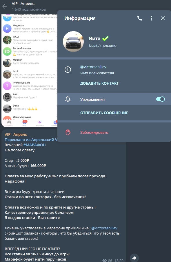 Это логично, ведь наряду с платными экспрессами и «умножением банка» тот призывает к участию в «марафонах». Их он проводит то ли сам с других аккаунтов, то ли с помощью «коллег». Один из них — аноним Витя @victorseniliev с ресурса VIP Апрель, и ссылки на идентичные временные «вип-чаты» среди контента Kalashmaksim появляются регулярно.