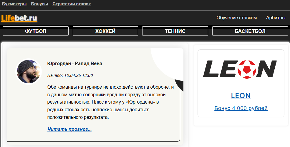 В 2025 году на сайте остались рейтинг букмекерских контор, обучающий контент по стратегиям и беттингу. Есть прогнозы с аналитикой, но их делает команда сайта.