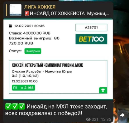 Телеграмм-канал Лига Хоккея: отзывы, результаты ставок, на чем зарабатывает каппер